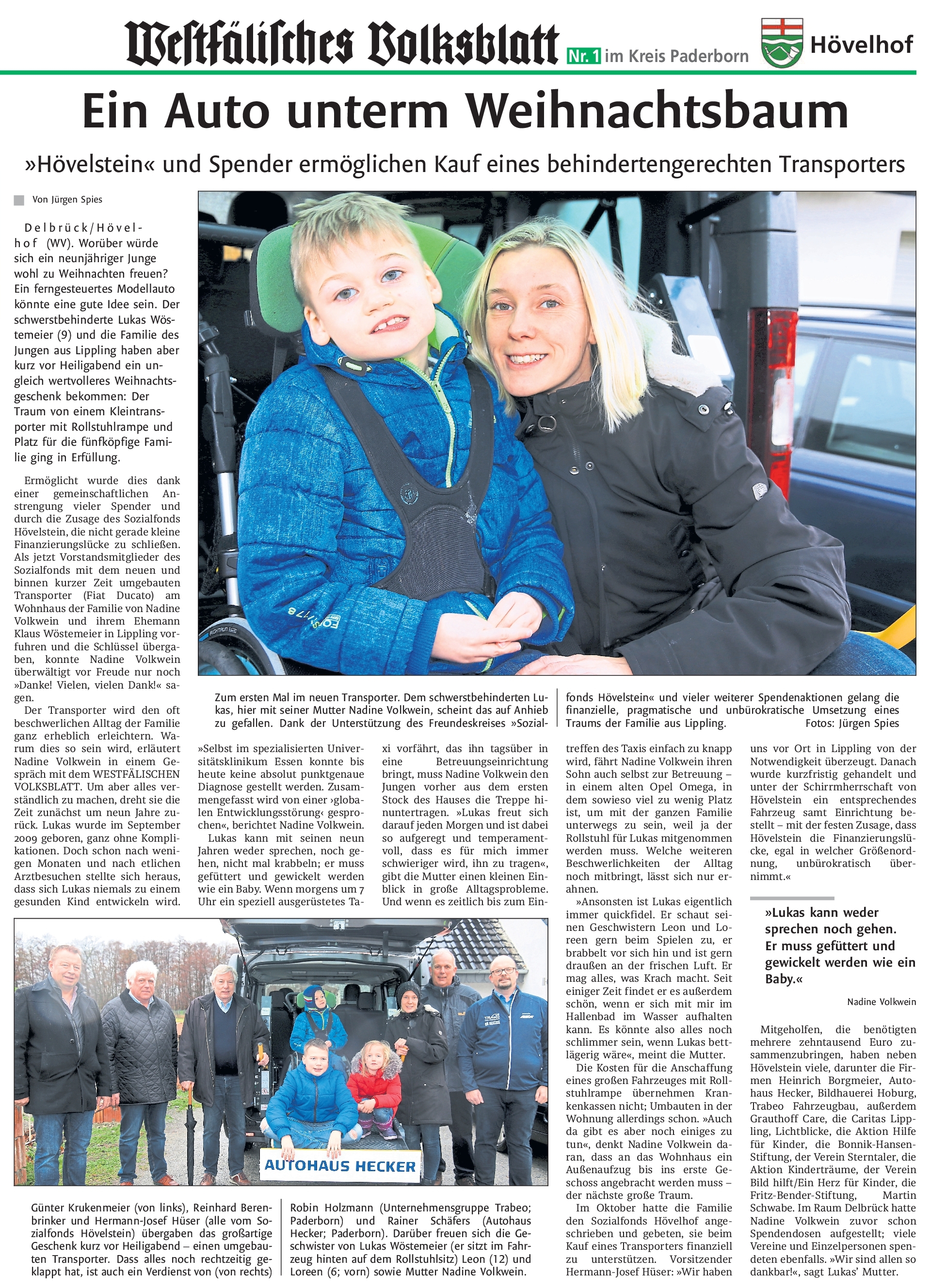 Auf Initiative des Sozialfonds Hövelstein und mit Unterstützung verschiedener Spender konnten wir kurz vor Weihnachten ein neues Fahrzeug an den schwerstbehinderten Lukas und seine Familie übergeben.